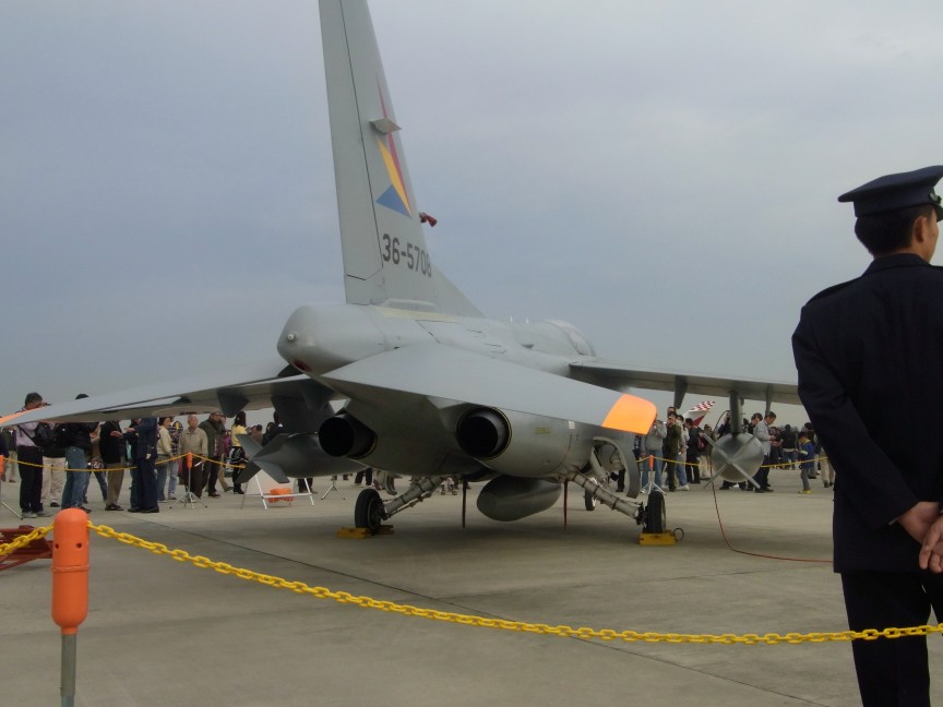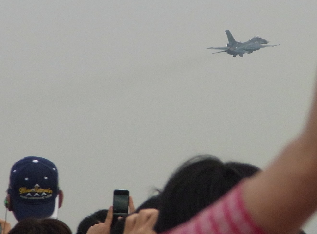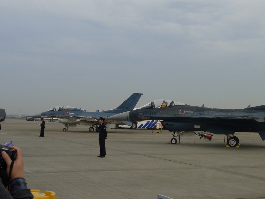 今年もF-2が飛来し、地上展示に加えて飛行展示も行われました。その離陸シーンを激写したかったのですが、何しろ相手は加速の鋭い戦闘機。滑走を始めるや否や、あっと言う間に天高く舞って行ってしまい、カメラを構える余裕などありませんでした。