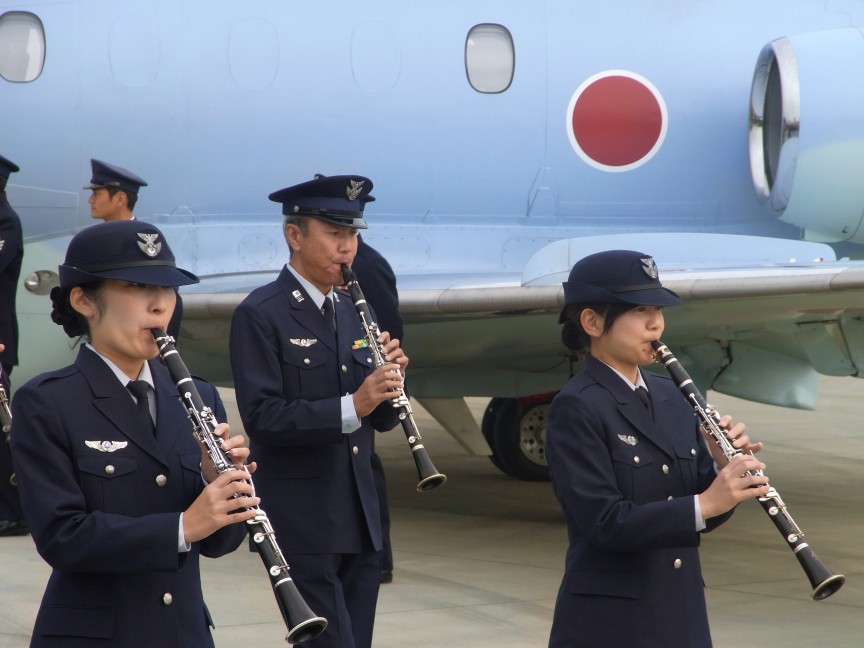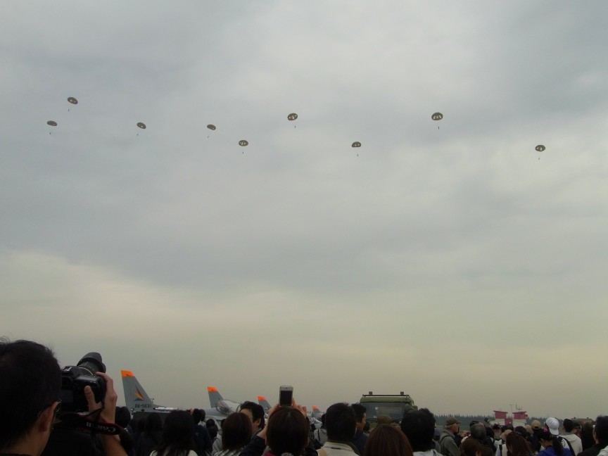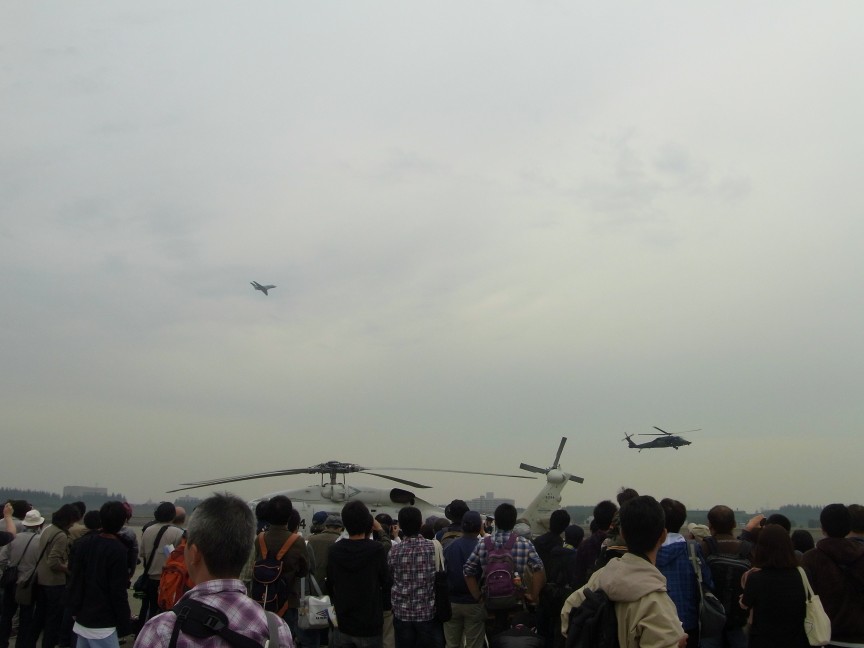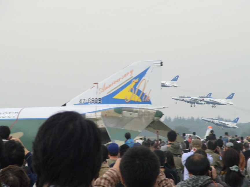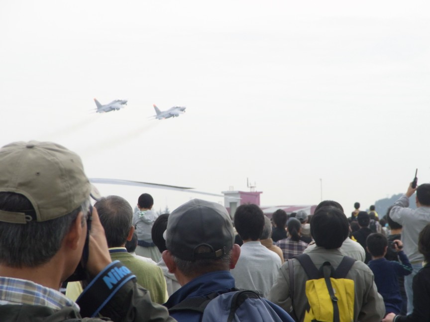 今回は東日本大震災で亡くなった方々のための慰霊飛行が行われました。私は正門前の行列に並んでいる時に見たのですが、低空を飛行するT-4四機編隊の中から一機がふわりと上昇を始める、という印象的な機動でした。「ミッシングマン・フォーメーション」というそうです。