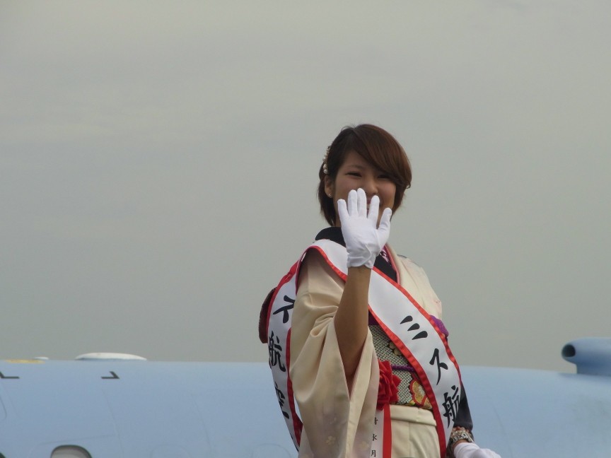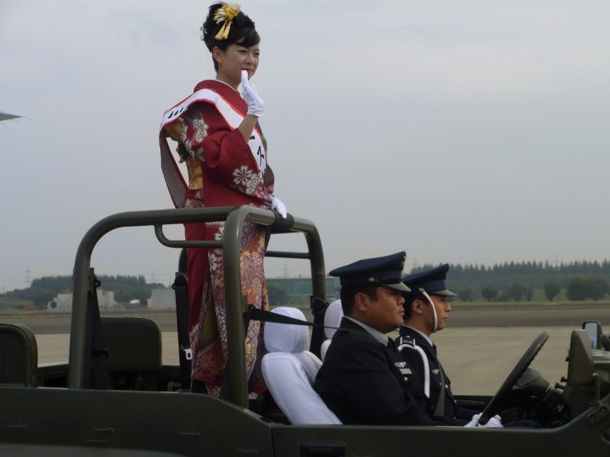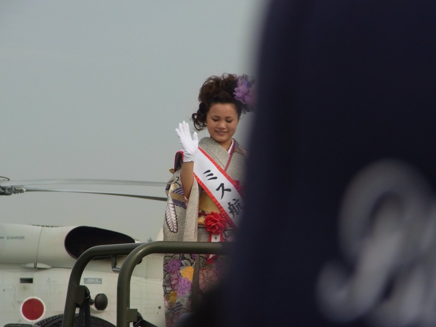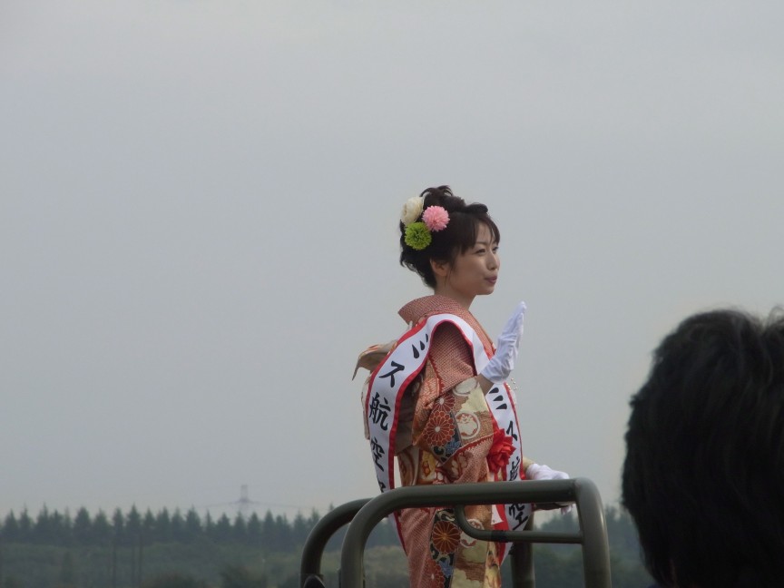ブルーインパルスの演技は無事に終了。地上に降り立った飛行士に、ミス航空祭から花束が贈られました。もっとも、その場面は前の方に陣取っている観客にしか見えないのですが。私は場内アナウンスの実況を聞いて様子を想像するしかありませんでした。