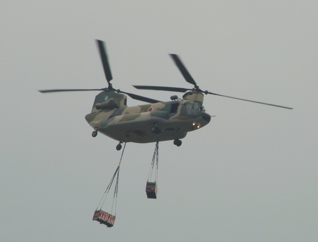 続いてCH-47「チヌーク」の飛行展示。東日本大震災後の災害復旧に役立てられている機体だけに、場内アナウンスを担当する隊員のテンションにも並々ならぬものが感じられました。(「ゴーゴーゴー、ヒャッホー!」などと叫んでいらっしゃいましたw)