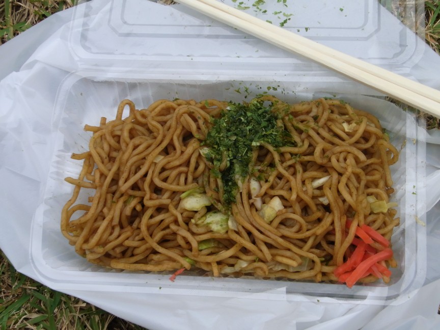昼食の焼きそば(350円)。人山から何とか脱出し、芝生のある所に行って食べました。食べ物は全般的に高いです。例えば、松屋の「牛めし」が500円だったりします。カレーライスもそのレベルの値段。