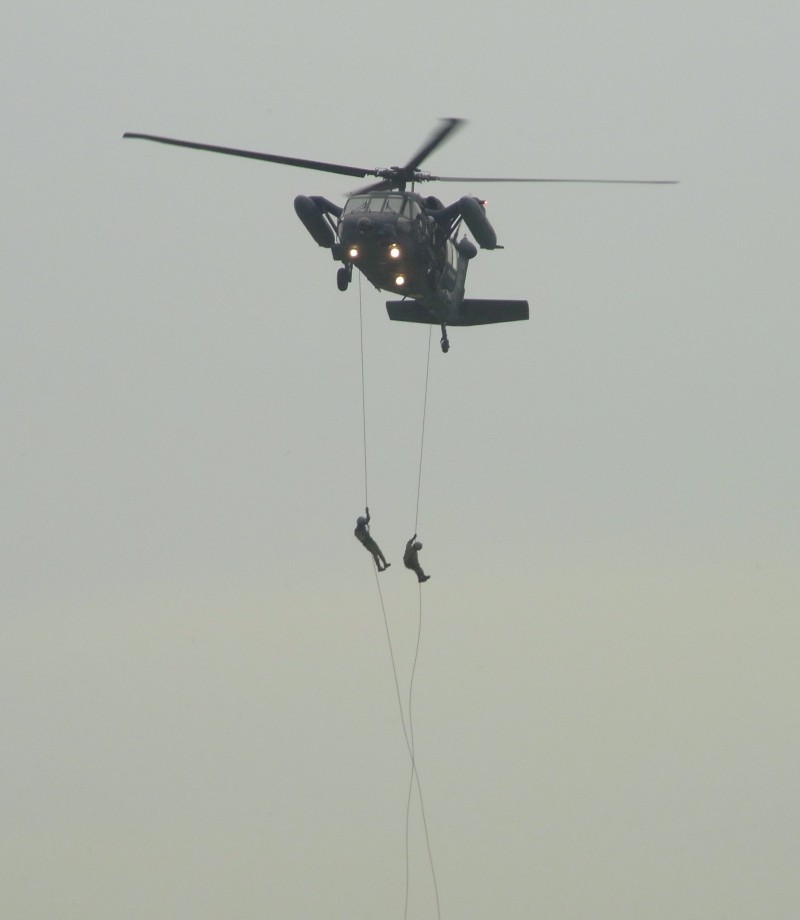 滑走路端でホバリングをしていたUH-60Jが猛然と前進。スピードが乗った所で機体を後方に傾け、急上昇します。
