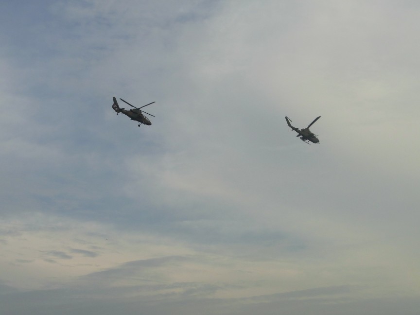 OH-1(左)とAH-1Sのツーショット。空が薄っすらと赤みを帯びてきました。